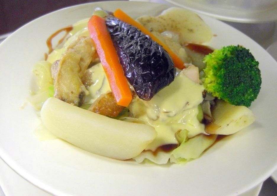 「鶏肉のポワレ 秋野菜添え」です。ポワレとはフランス語で“蒸し焼き”という意味です。 ナスや茸、じゃが芋など旬の野菜をたくさん添えました。やわらかく焼きあがった「鶏肉」とたっぷりの野菜を、赤ワインとマスタードの2種類のソースで召し上がっていただきました。