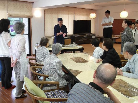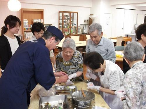 きれいに着色した白餡で黒餡を包みます。 木製の道具を使って切込みを入れたり、木の葉を作ってのせたりします。 皆さん、いつの間にか前に出てきて積極的に教えてもらっています。