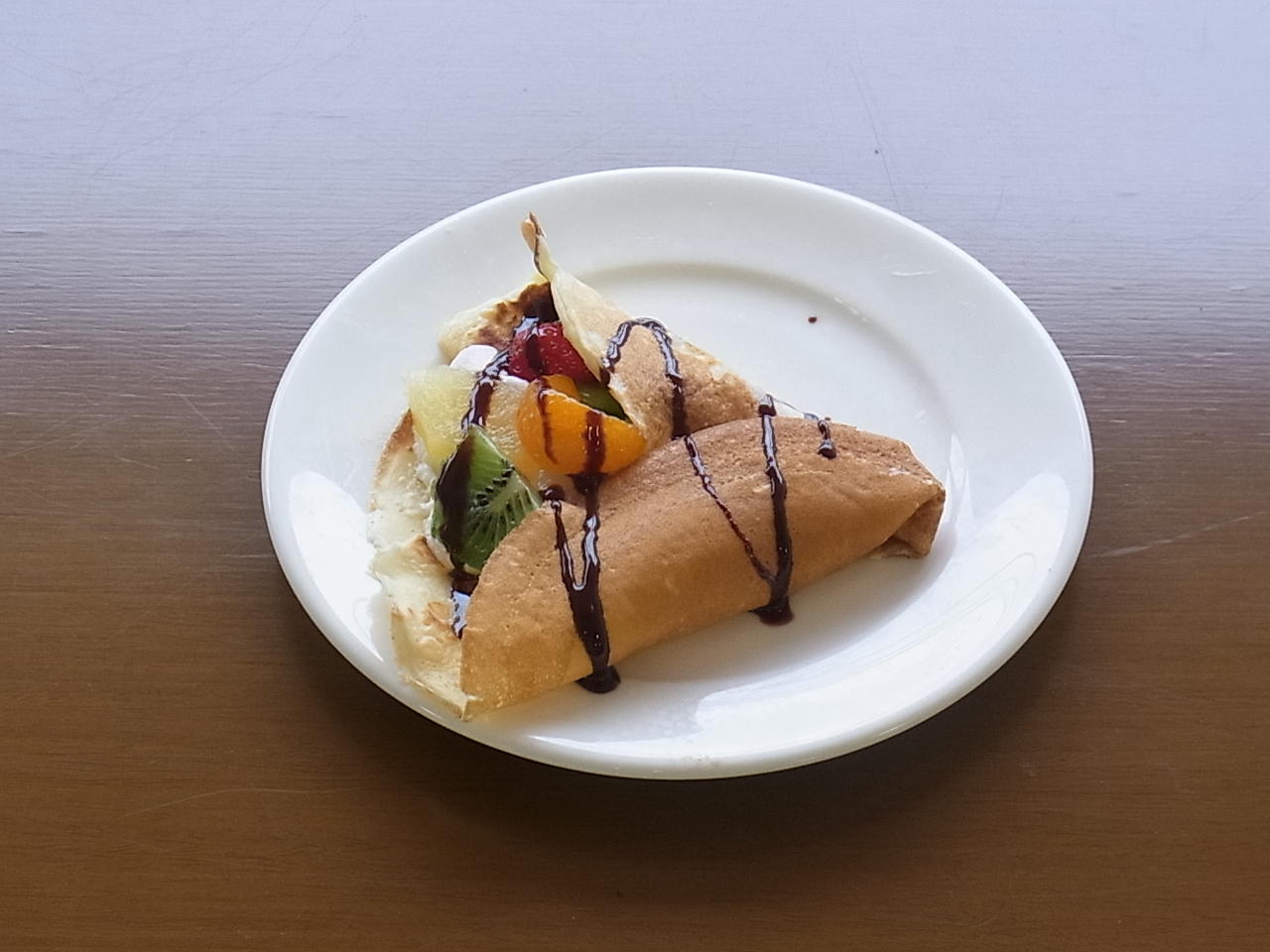 トッピングにカットフルーツ、チョコレートソース、ホイップクリーム、あんこ、メープルシロップ、フルーツジャムを用意。お好みのものをのせて巻いていただきました。
