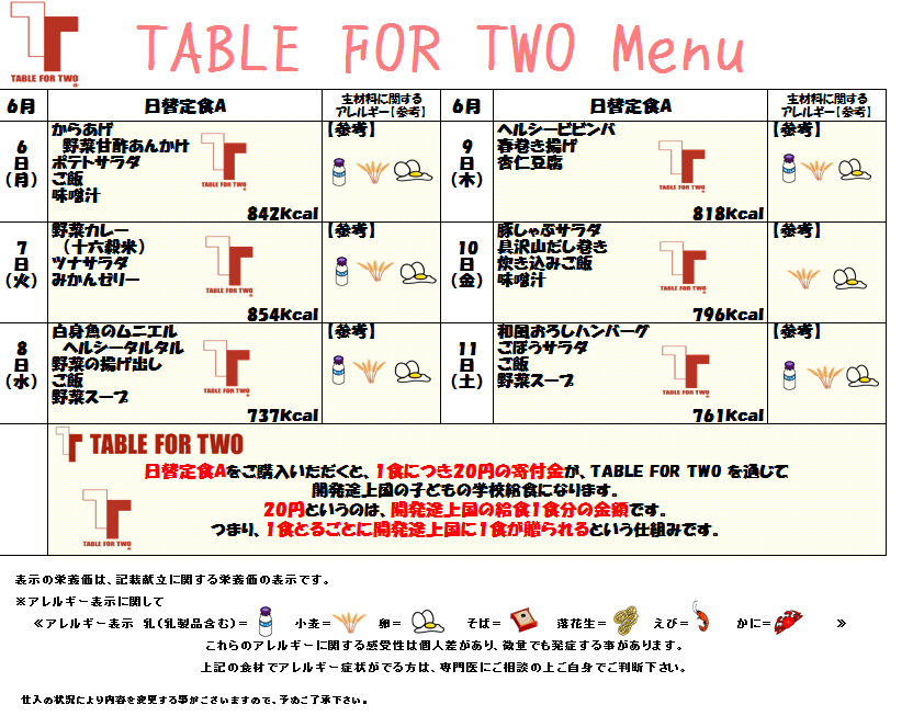 TABLE FOR TWOとは対象メニュー1食につき20円が寄付され、開発途上国の学校給食の1食になるという取り組みです。
